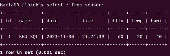 insert into sensor (name, date, time, illu, temp, humi) value ("KHJ_SQL", now(),now(), 60, 20, 40);